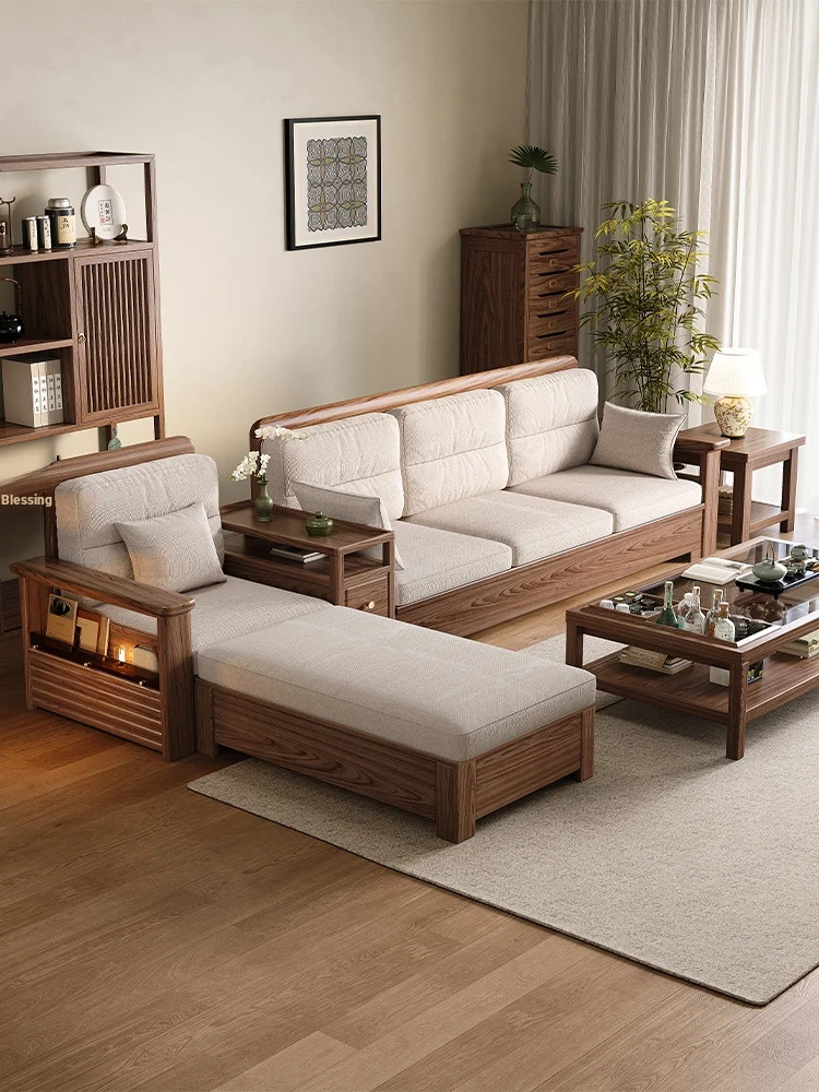 Light Luxury New Chinese Style Walnut Wood Sofa - Modern Minimalist Chaise Lounge for Small Spaces, Perfect for Year-Round Comfort with Storage Options in Living Room