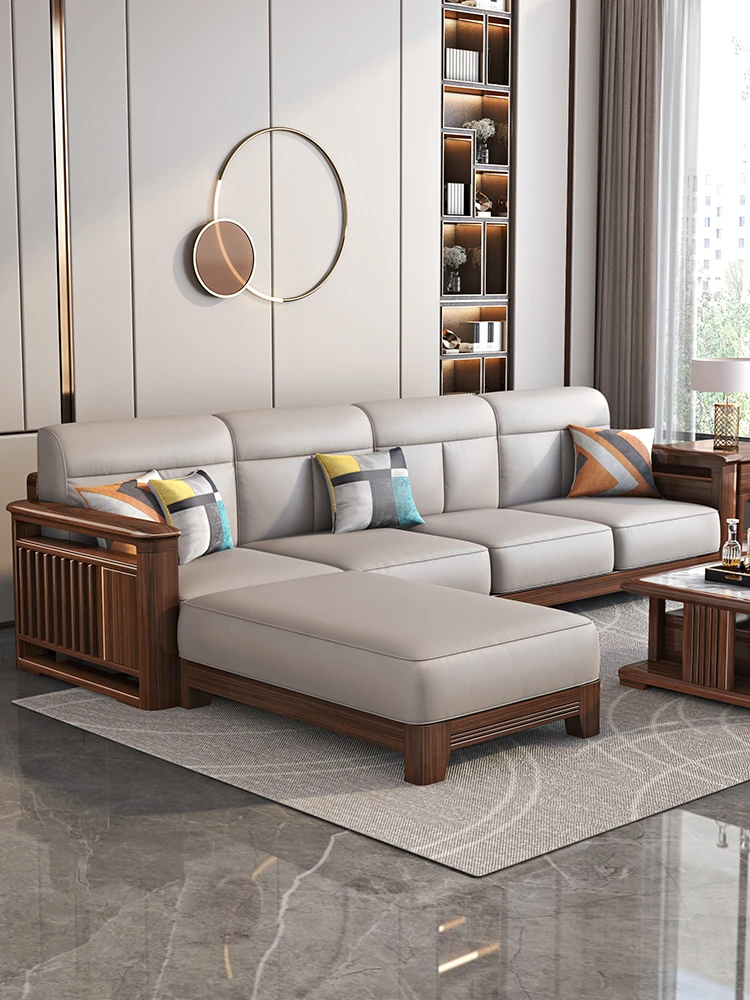 Modern Chinese Solid Wood Sofa - Walnut Small Apartment Living Room, Ultra-Fine Leather, Elegant Corner Chaise Lounge, Minimalist Design for Stylish Interiors