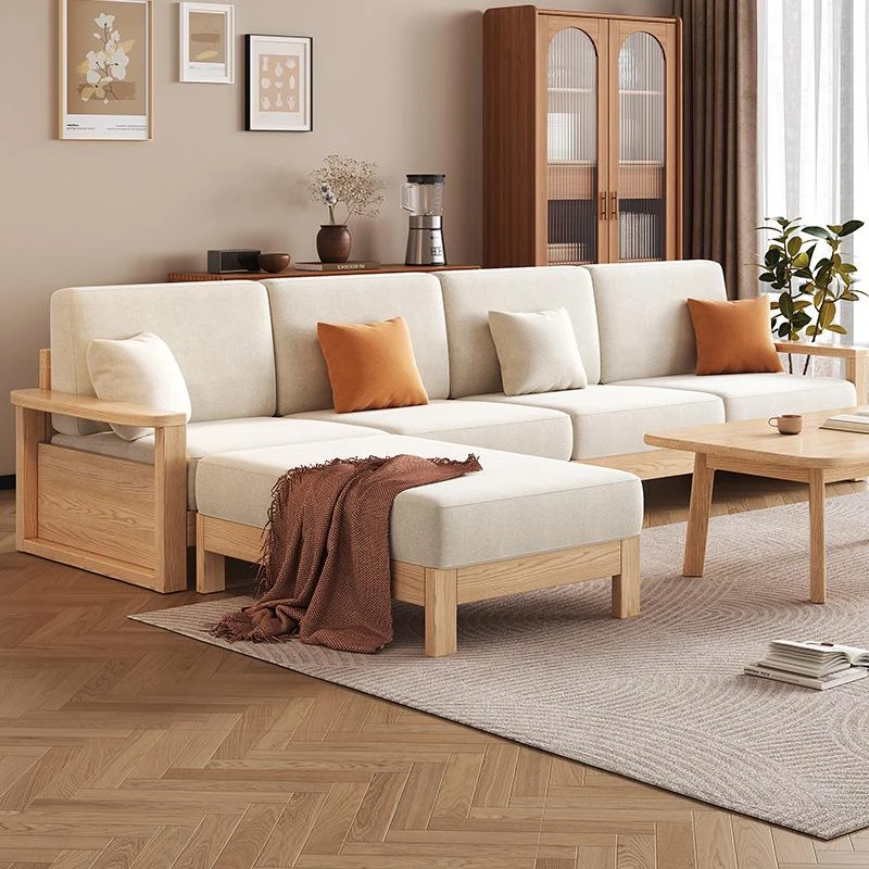 Nordic Ash Wood Solid Sofa Set - Creamy Natural Style Corner Chaise Lounge for Small Living Rooms, Perfect for Compact Spaces