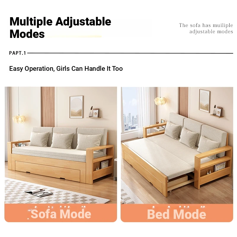 Free Shipping in Hong Kong: Versatile Solid Wood Sofa Bed for Small Spaces - Stylish and Functional Folding Design with Rubber Wood and Fabric Upholstery. Perfect for Your Living Room!