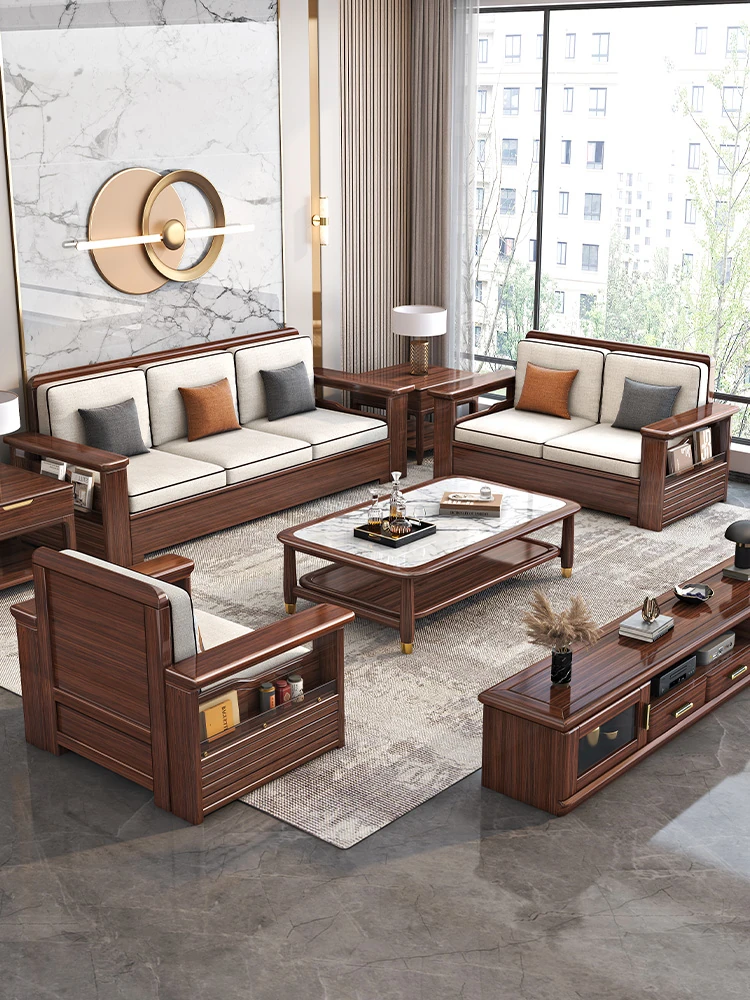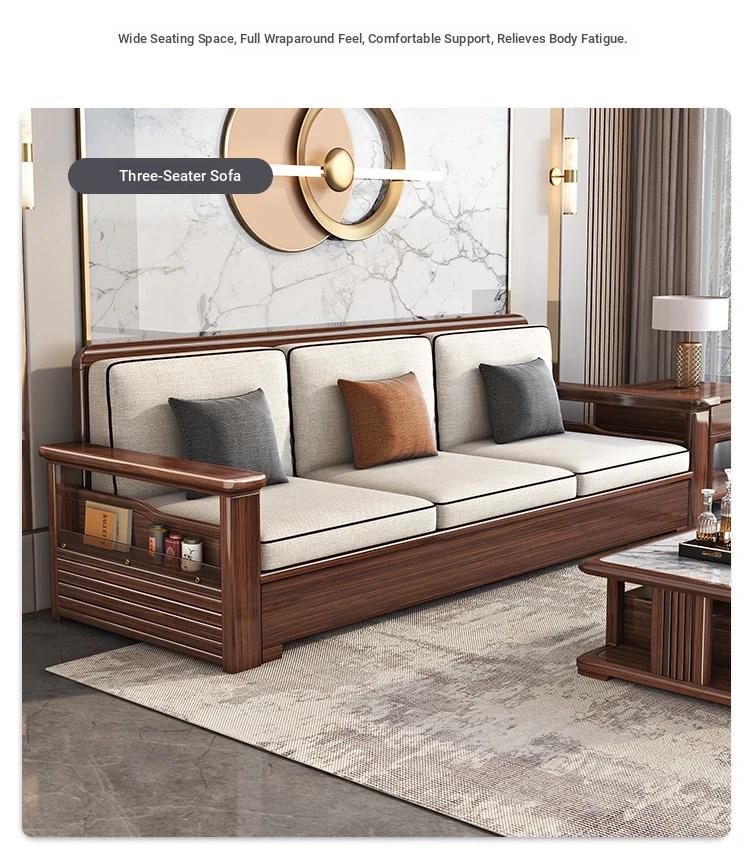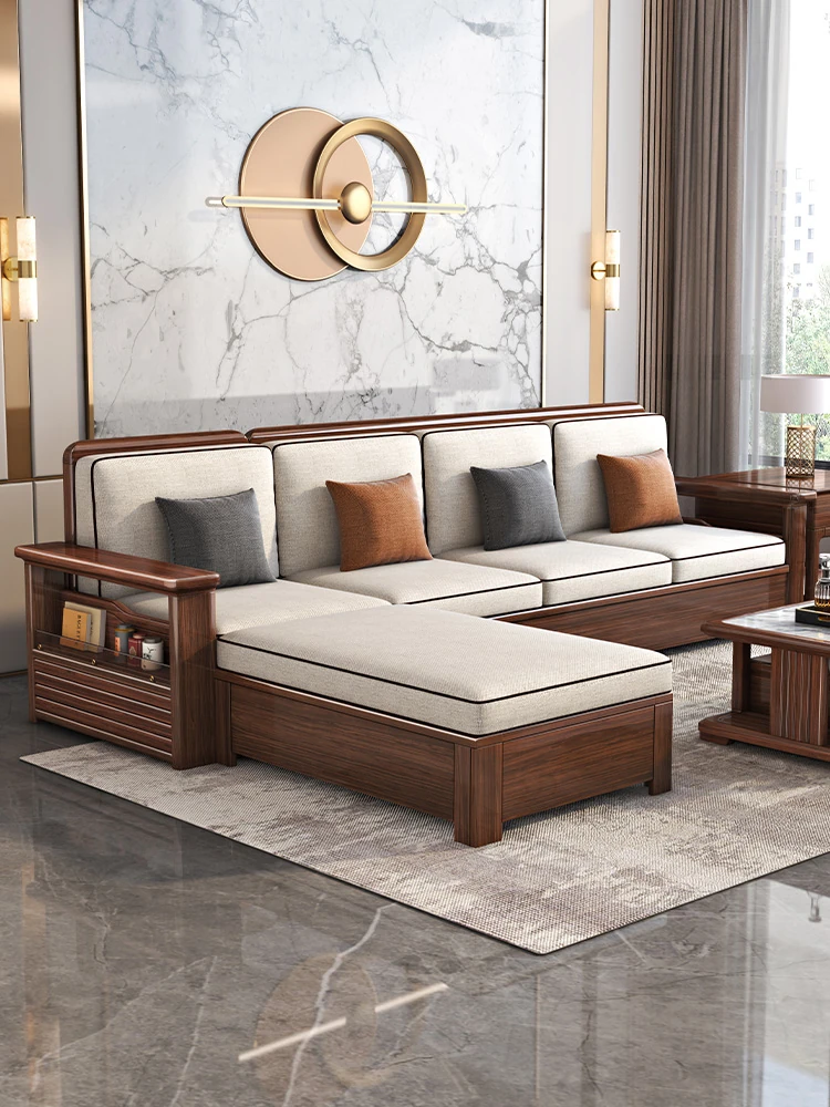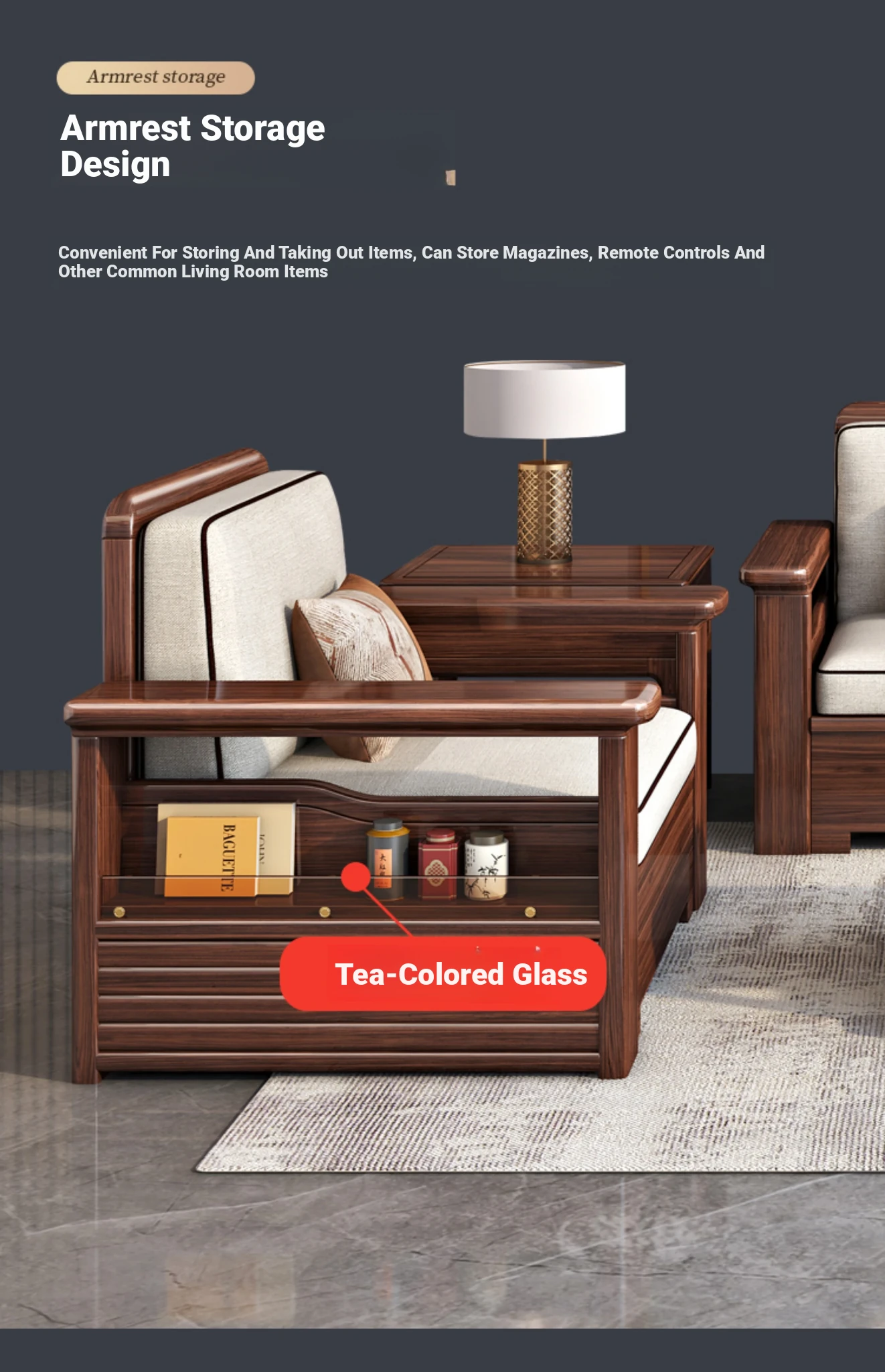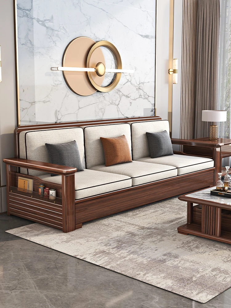 Light Luxury New Chinese Style Walnut Wood Sofa - Modern Minimalist Chaise Lounge for Small Spaces, Perfect for Year-Round Comfort with Storage Options in Living Room