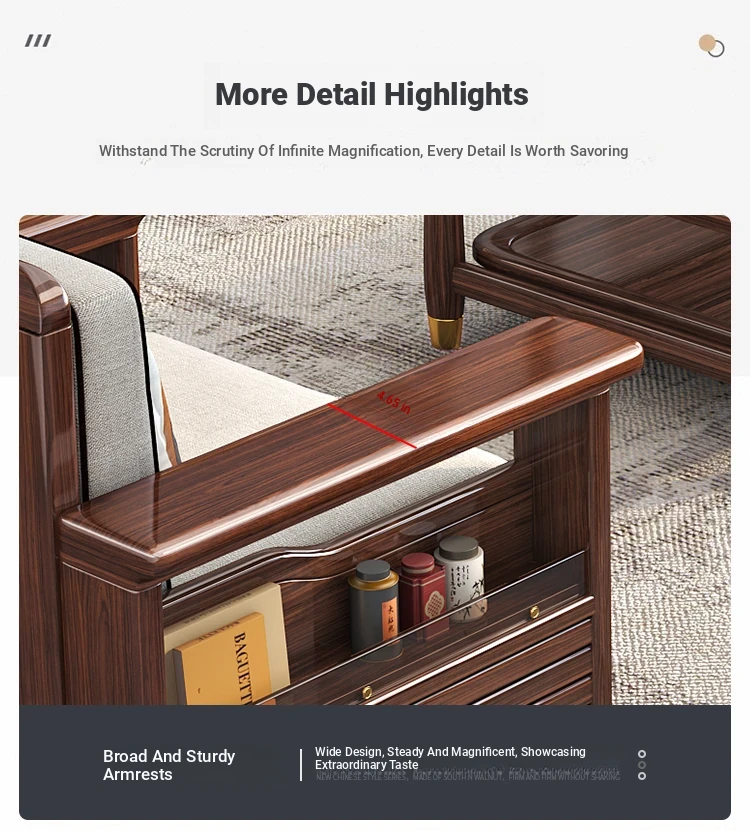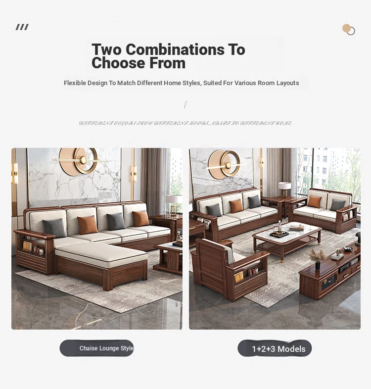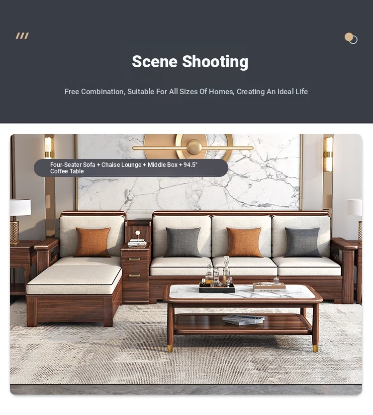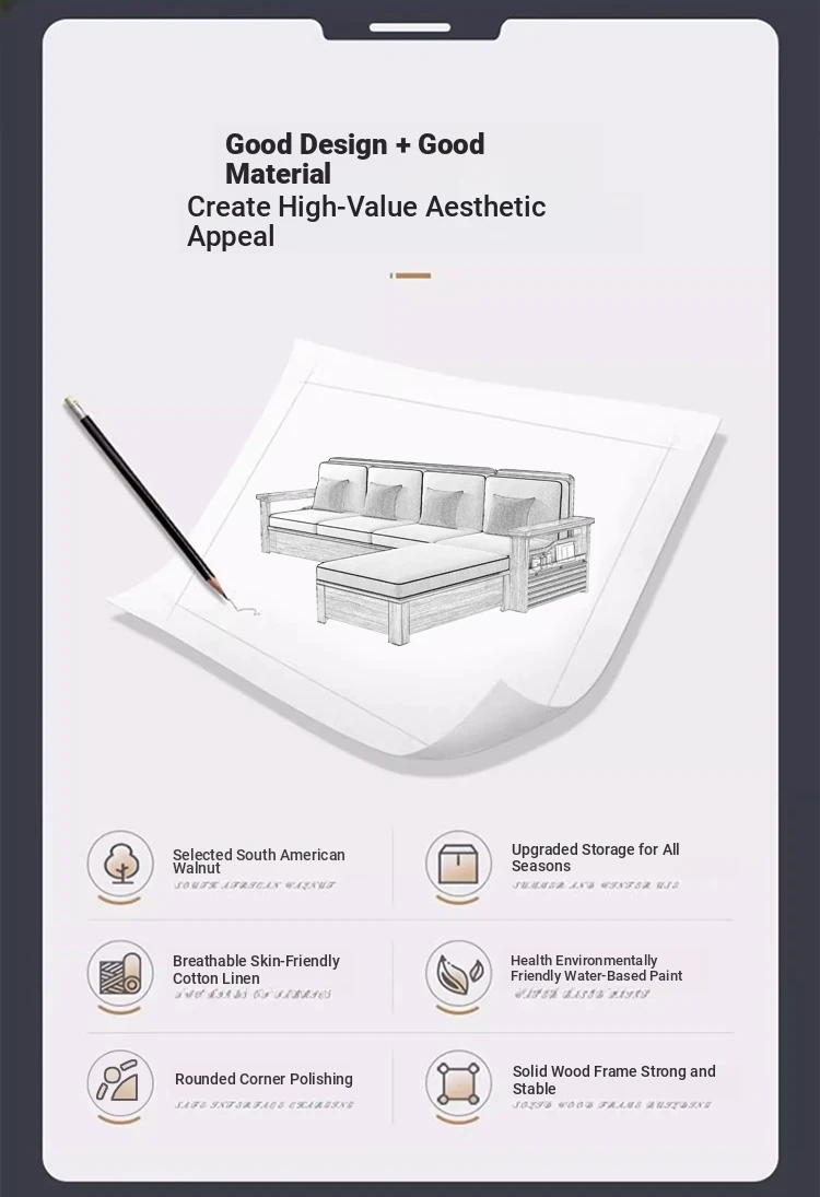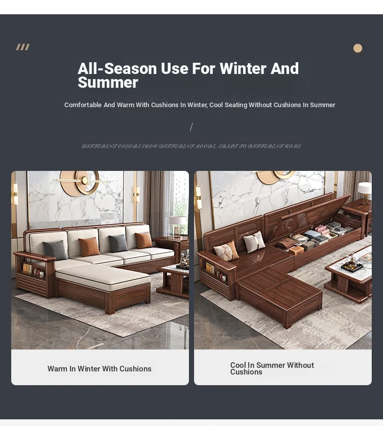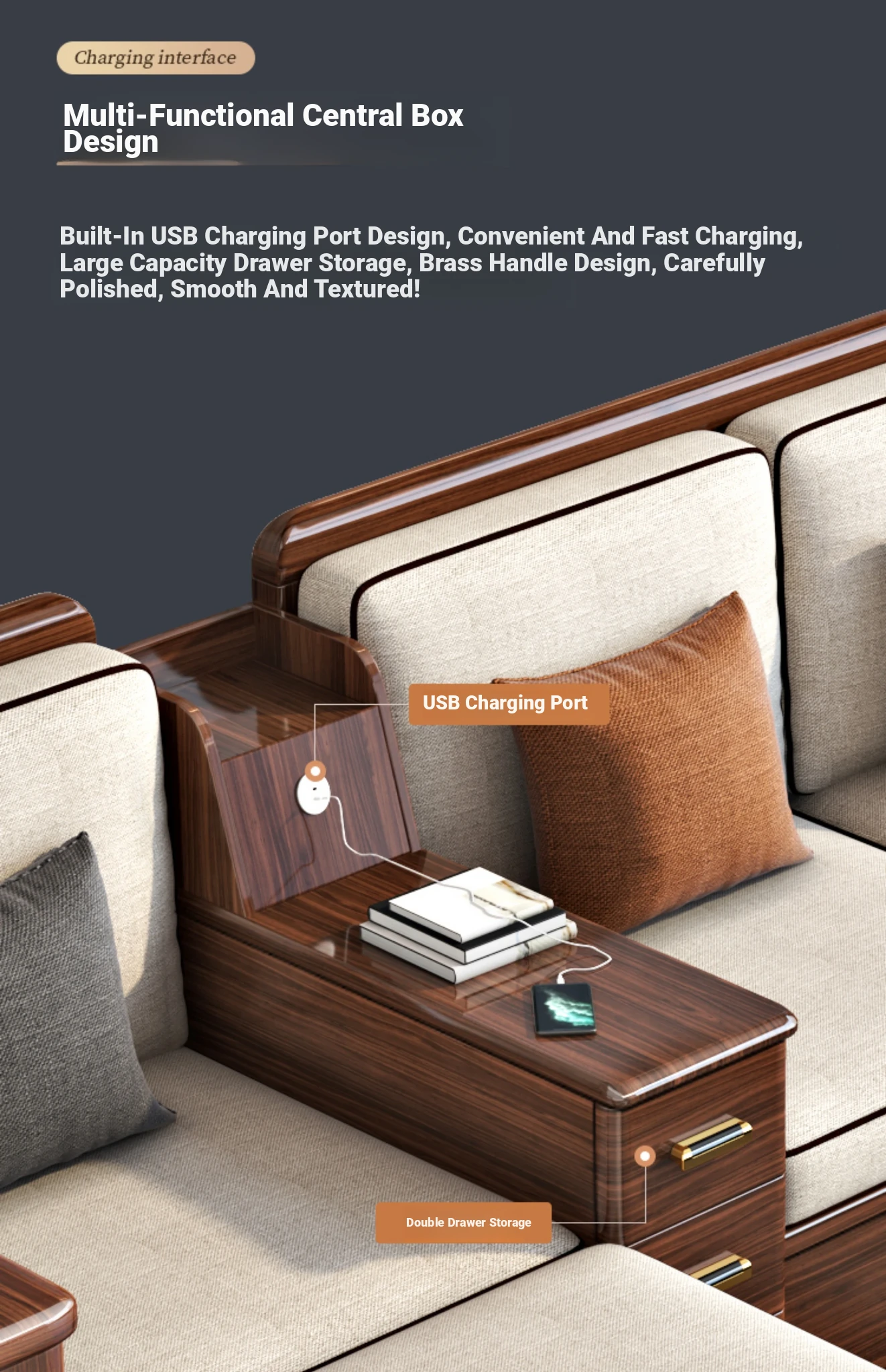 Light Luxury New Chinese Style Walnut Wood Sofa - Modern Minimalist Chaise Lounge for Small Spaces, Perfect for Year-Round Comfort with Storage Options in Living Room