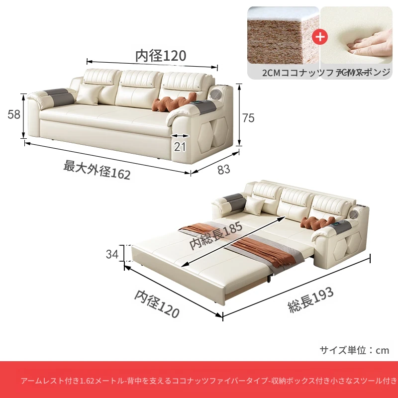 含肘掛け1.62メートル-高反発ウレタンタイプ-収納ボックス付き小椅子付き