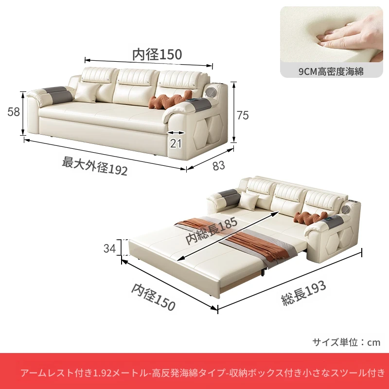 含肘掛け1.92メートル-高反発ウレタンタイプ-収納ボックス付き小椅子付き