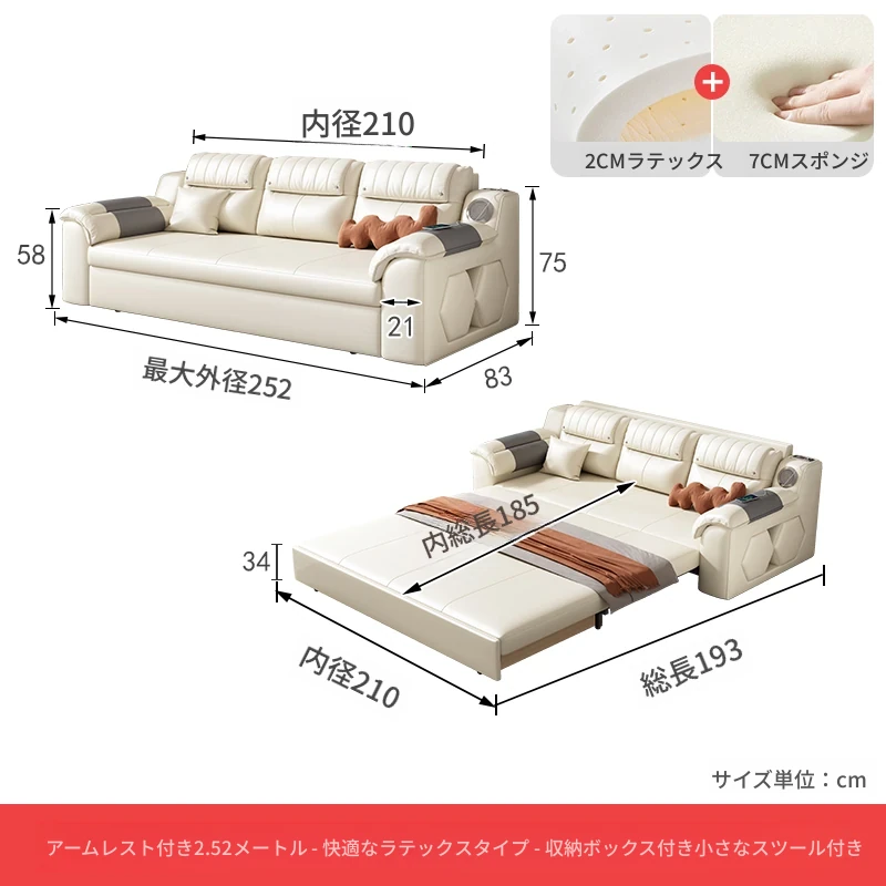 含肘掛け2.52メートル-快適ラテックスタイプ-収納ボックス付き小椅子付き