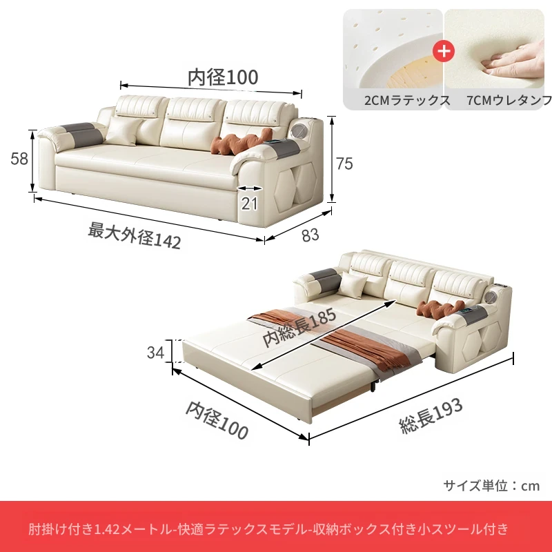 含肘掛け1.42メートル-快適ラテックスタイプ-収納ボックス付き小椅子付き