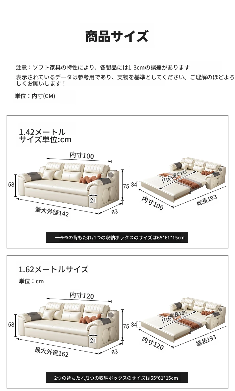 含肘掛け1.62メートル-快適ラテックスタイプ-収納ボックス付き小椅子付き