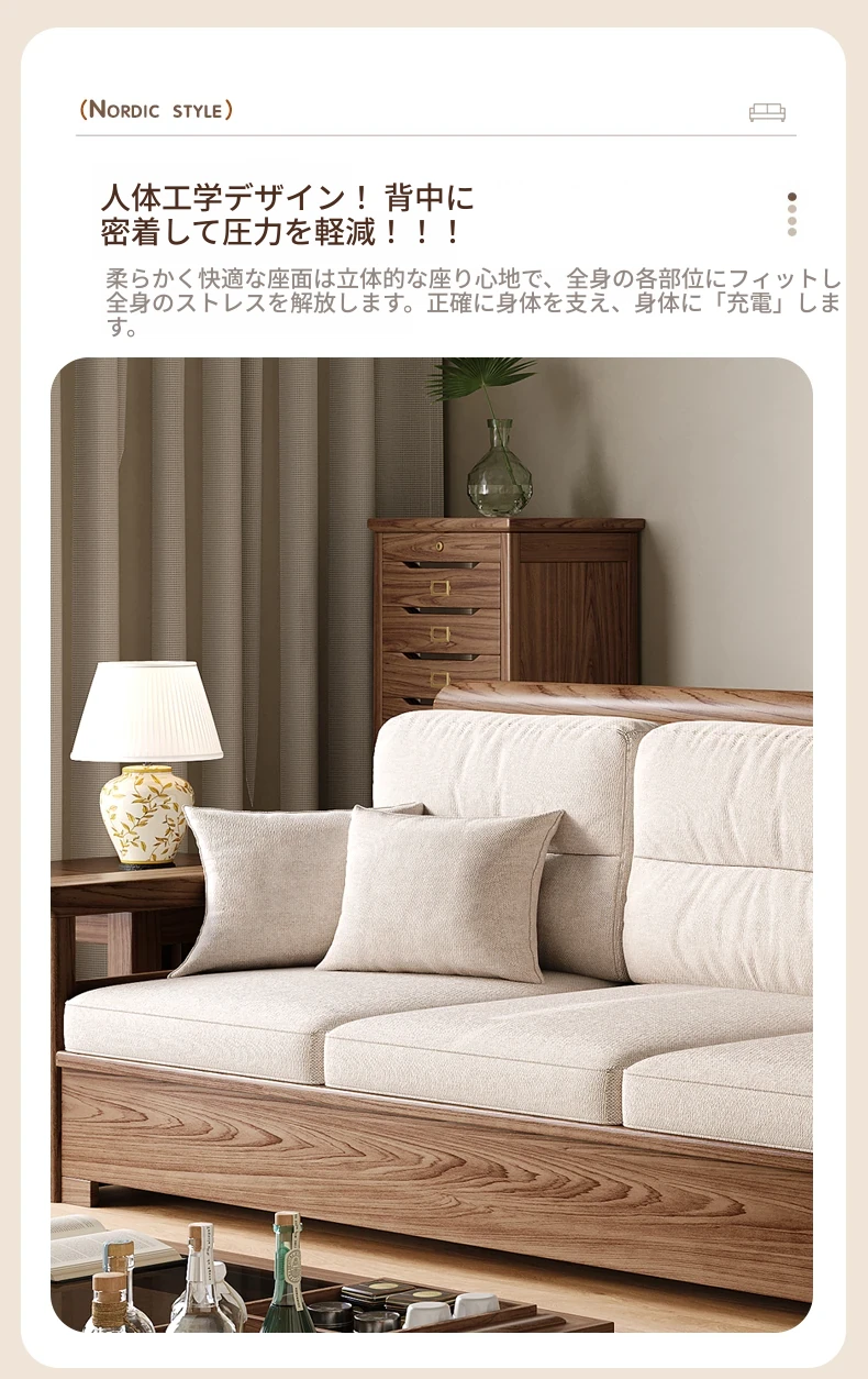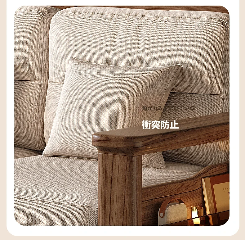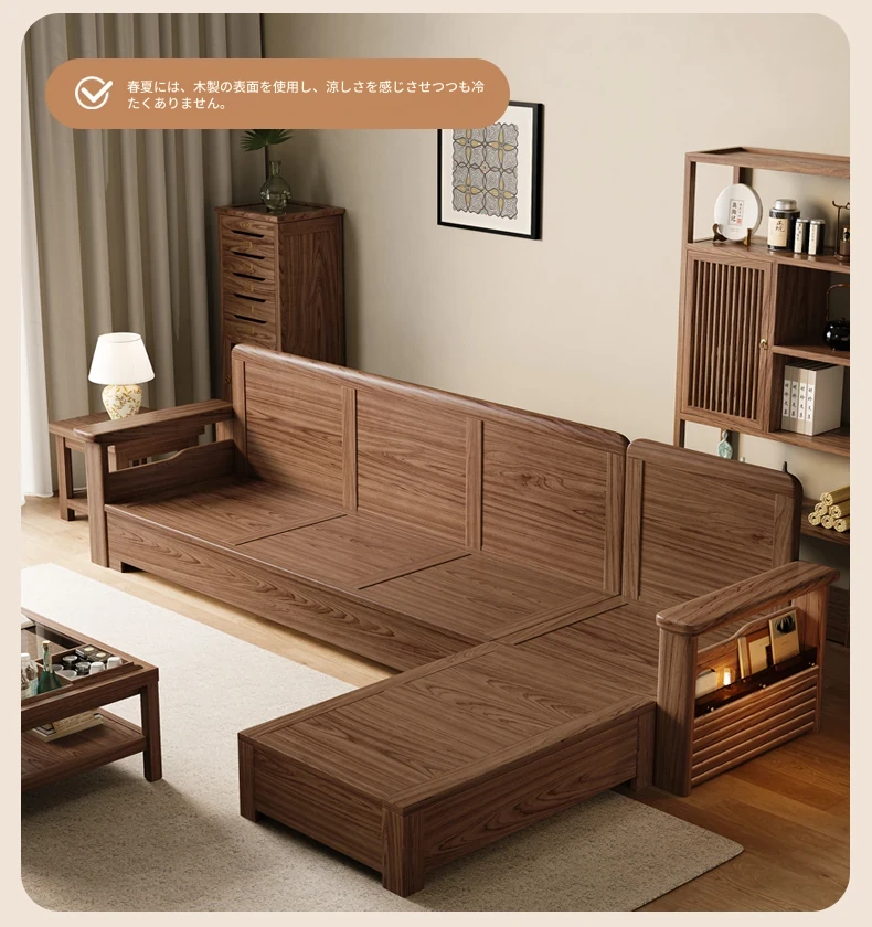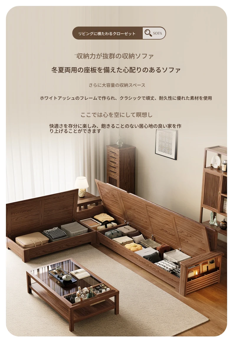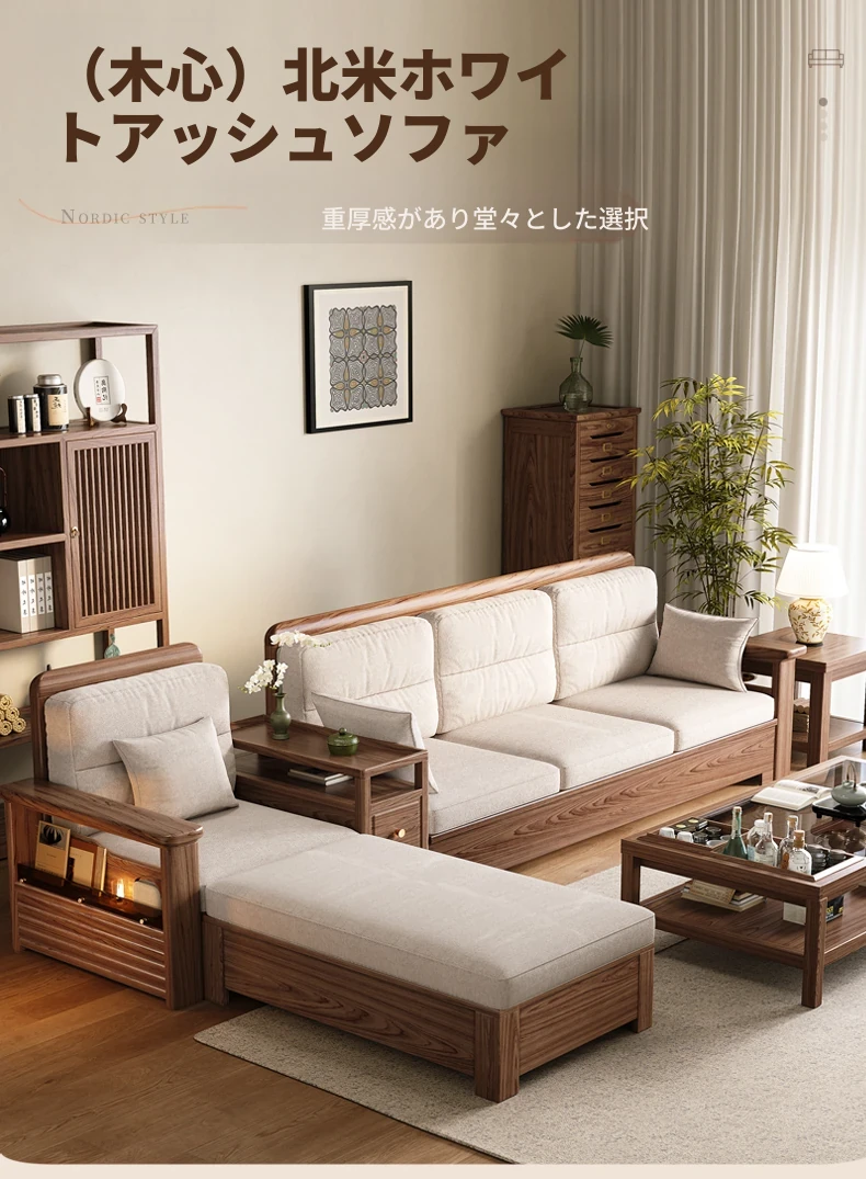 新中式スタイルの無垢材使用!冬夏両用のコンパクトソファセット。経済的なホワイトアッシュ材の収納ソファで、狭いスペースでもおしゃれに快適なリビングを実現!