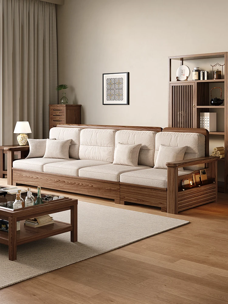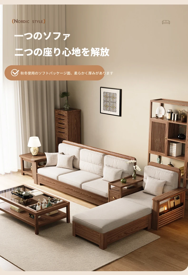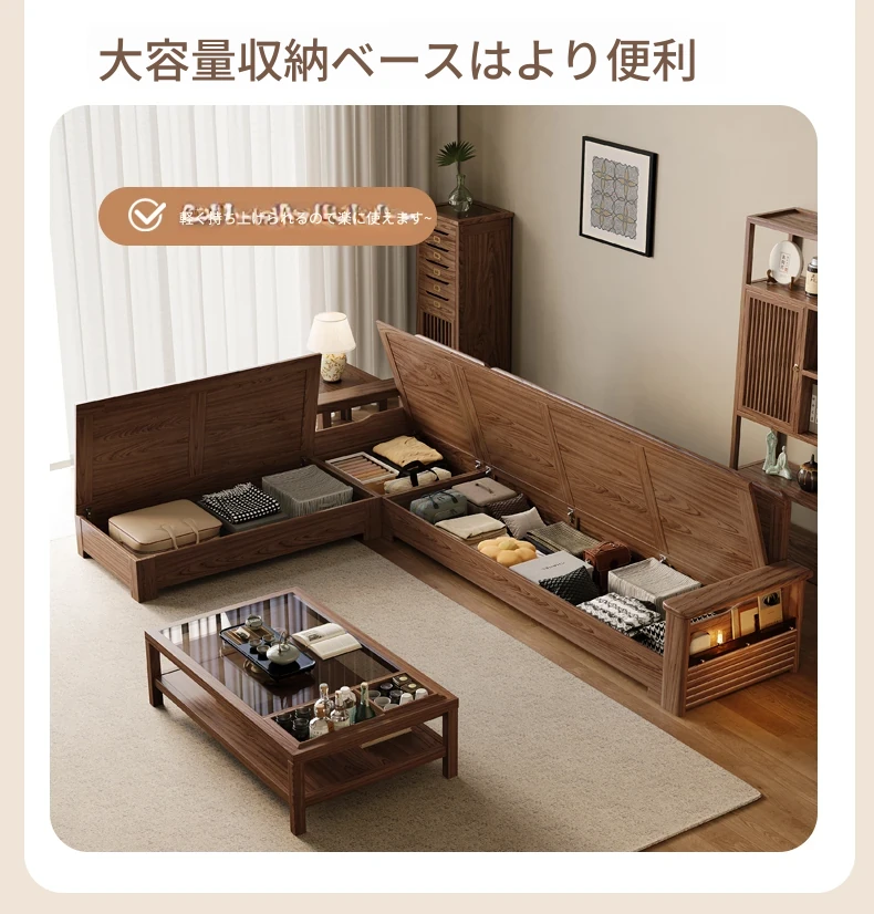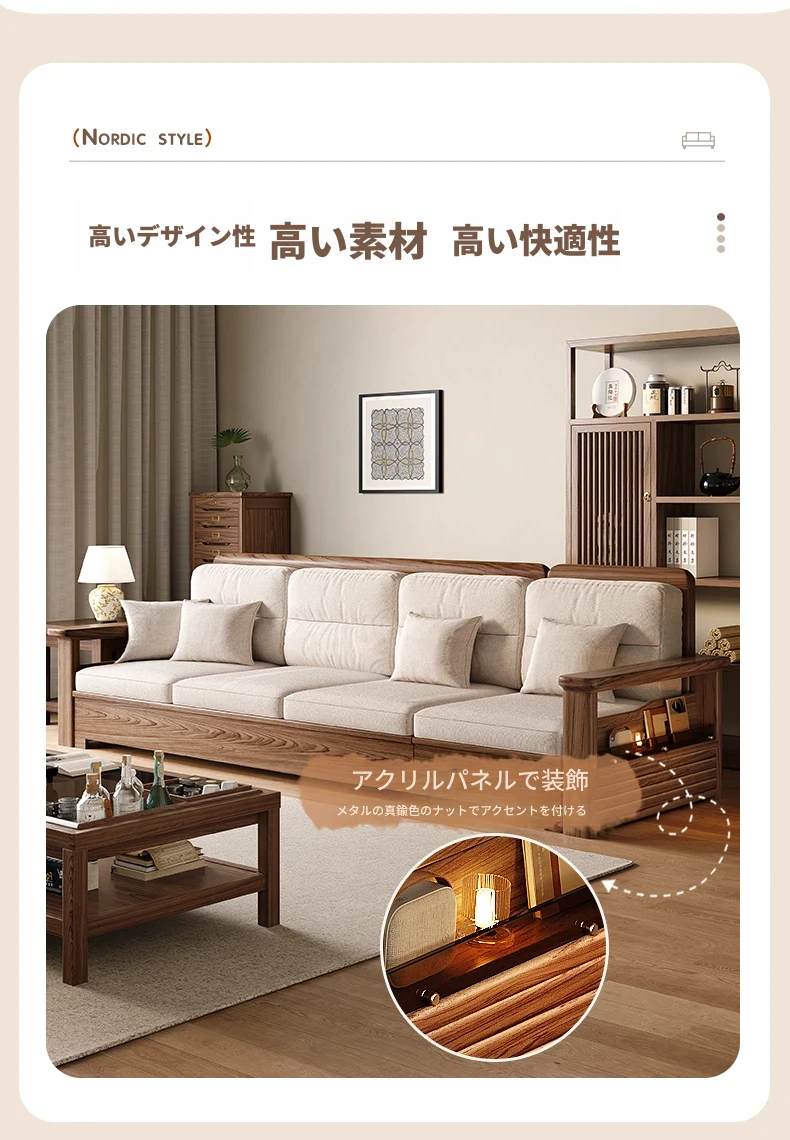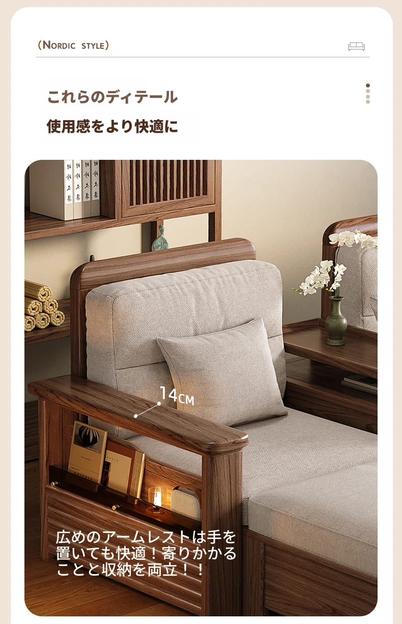 新中式スタイルの無垢材使用!冬夏両用のコンパクトソファセット。経済的なホワイトアッシュ材の収納ソファで、狭いスペースでもおしゃれに快適なリビングを実現!