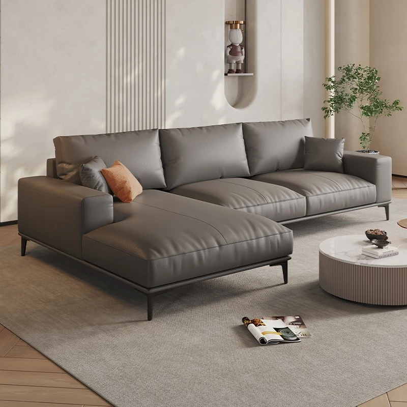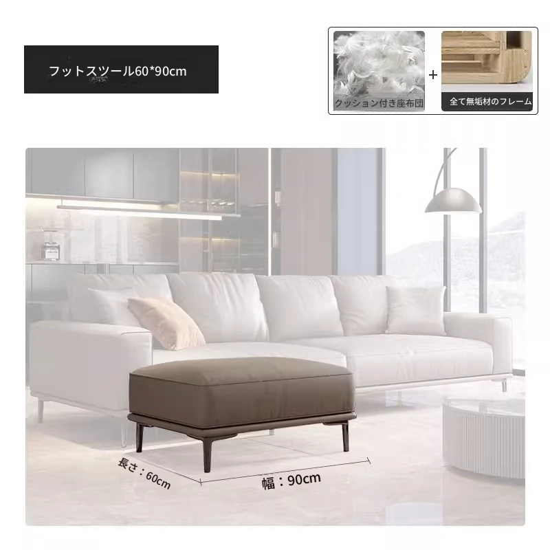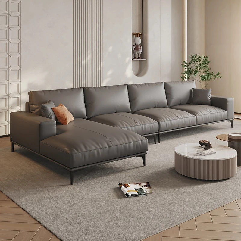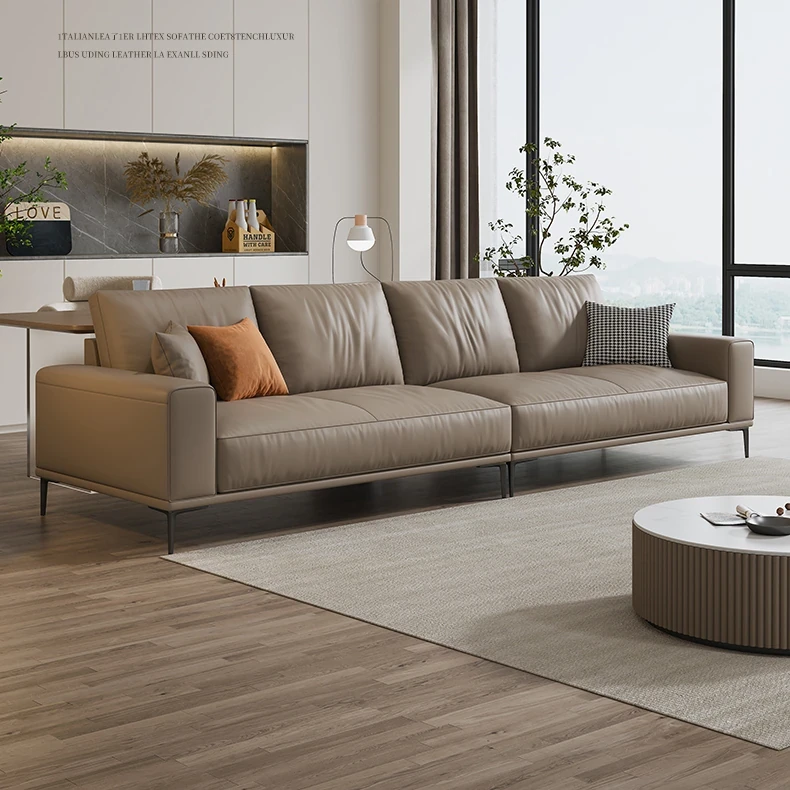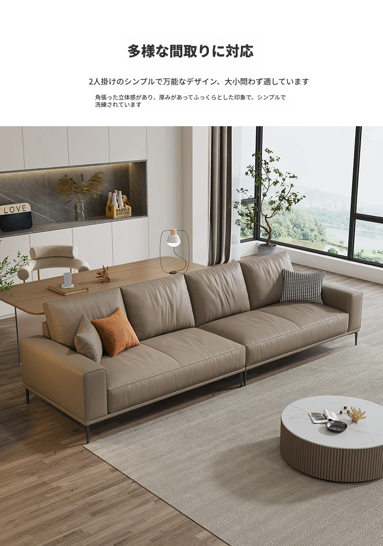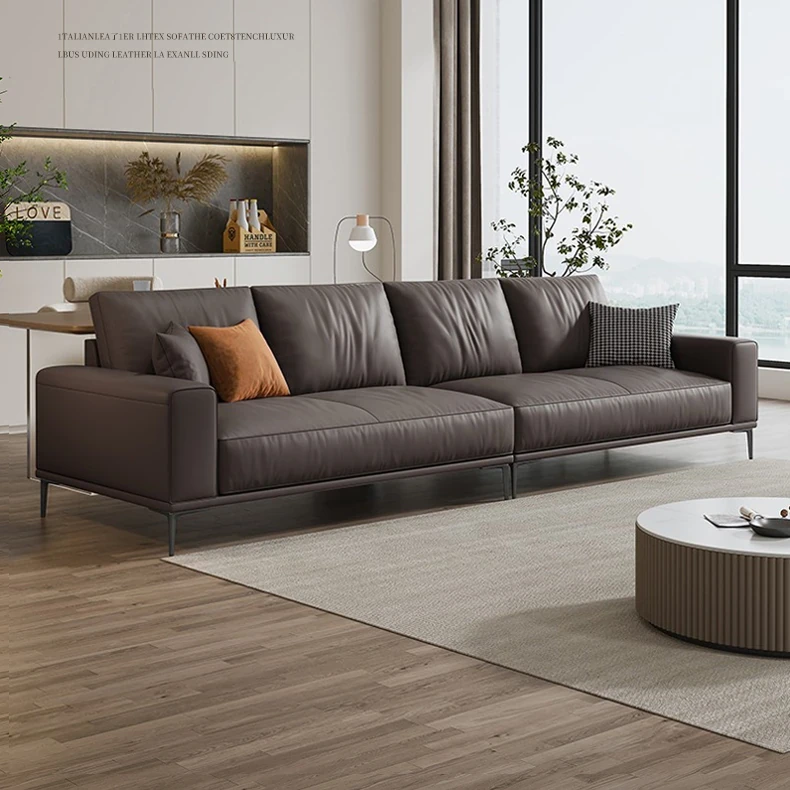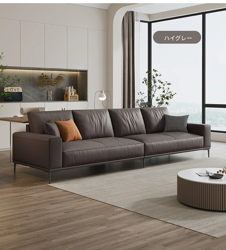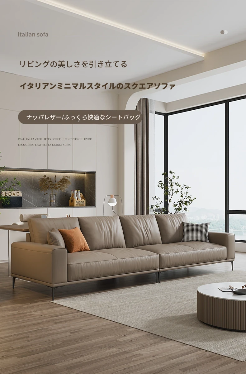 イタリアンミニマルデザイン本革ソファー|小型リビングに最適なラグジュアリー現代的シンプルスタイル|高級牛革使用のブロック型|4人掛け直列タイプで快適な座り心地を実現!