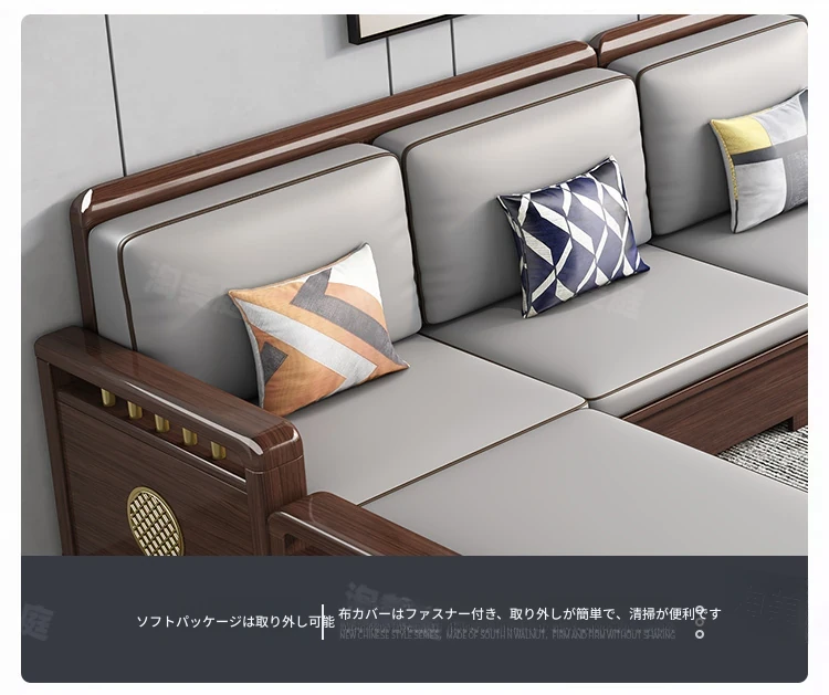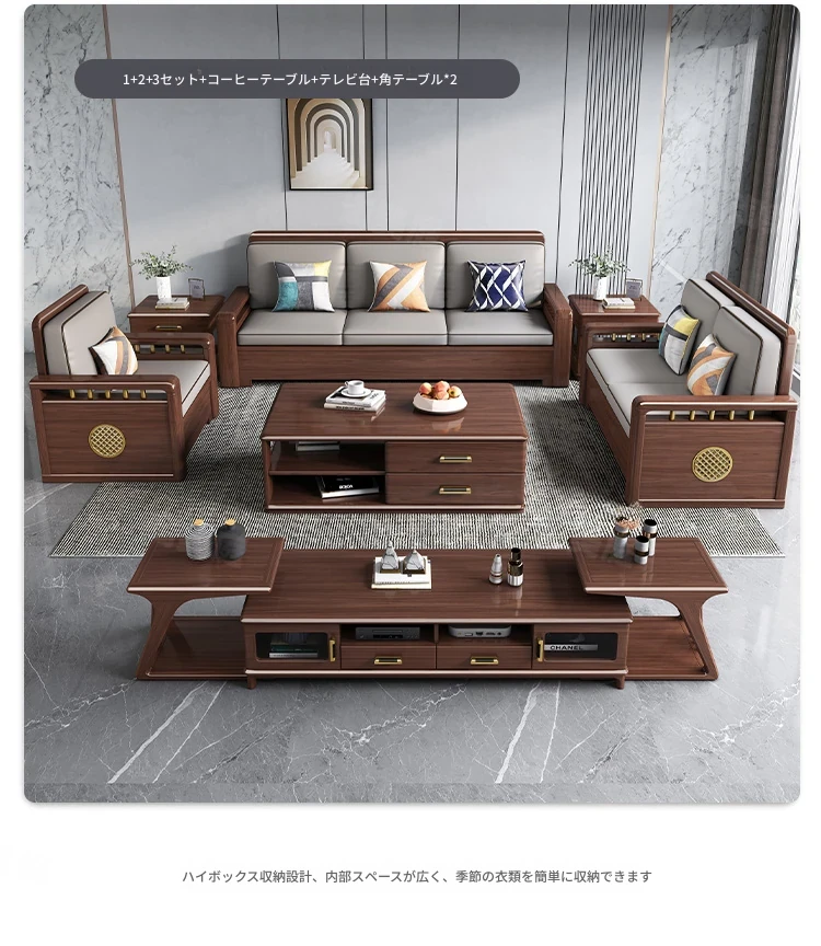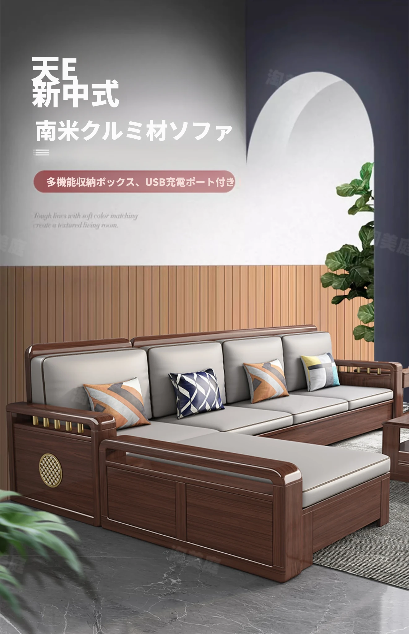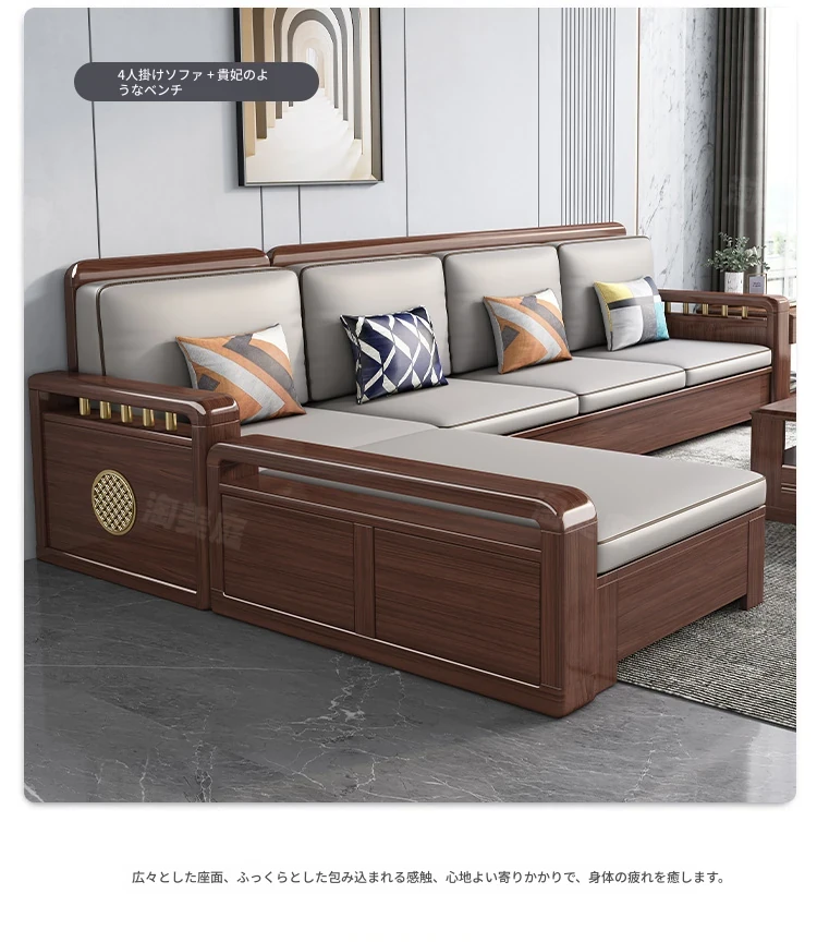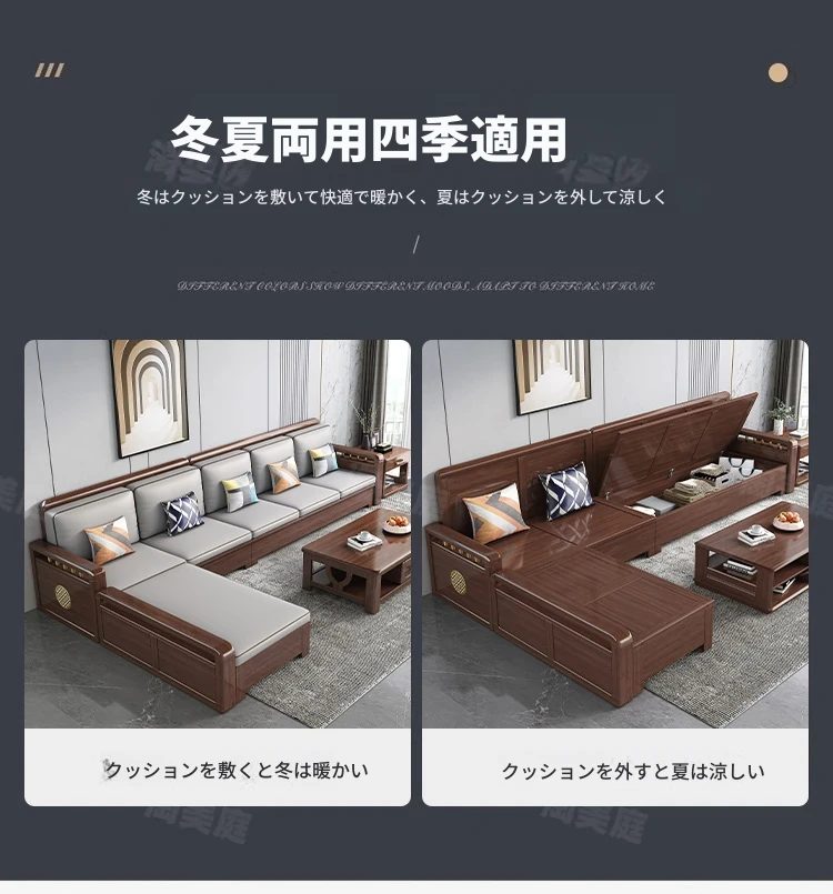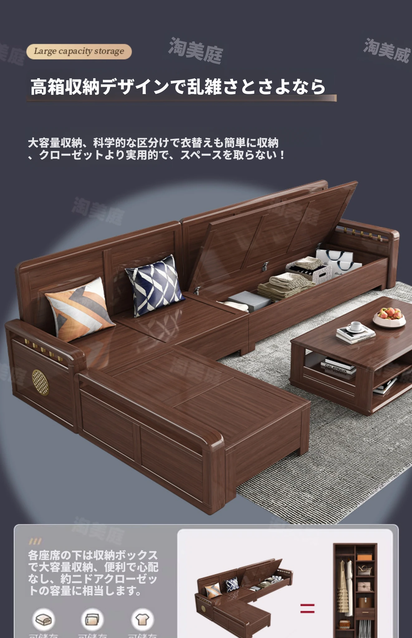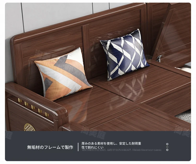 新中式全実木ソファ|モダンでシンプルなリビング向け|小型住宅に最適な収納付き|冬夏両用のクルミ材ソファで快適な空間を実現!